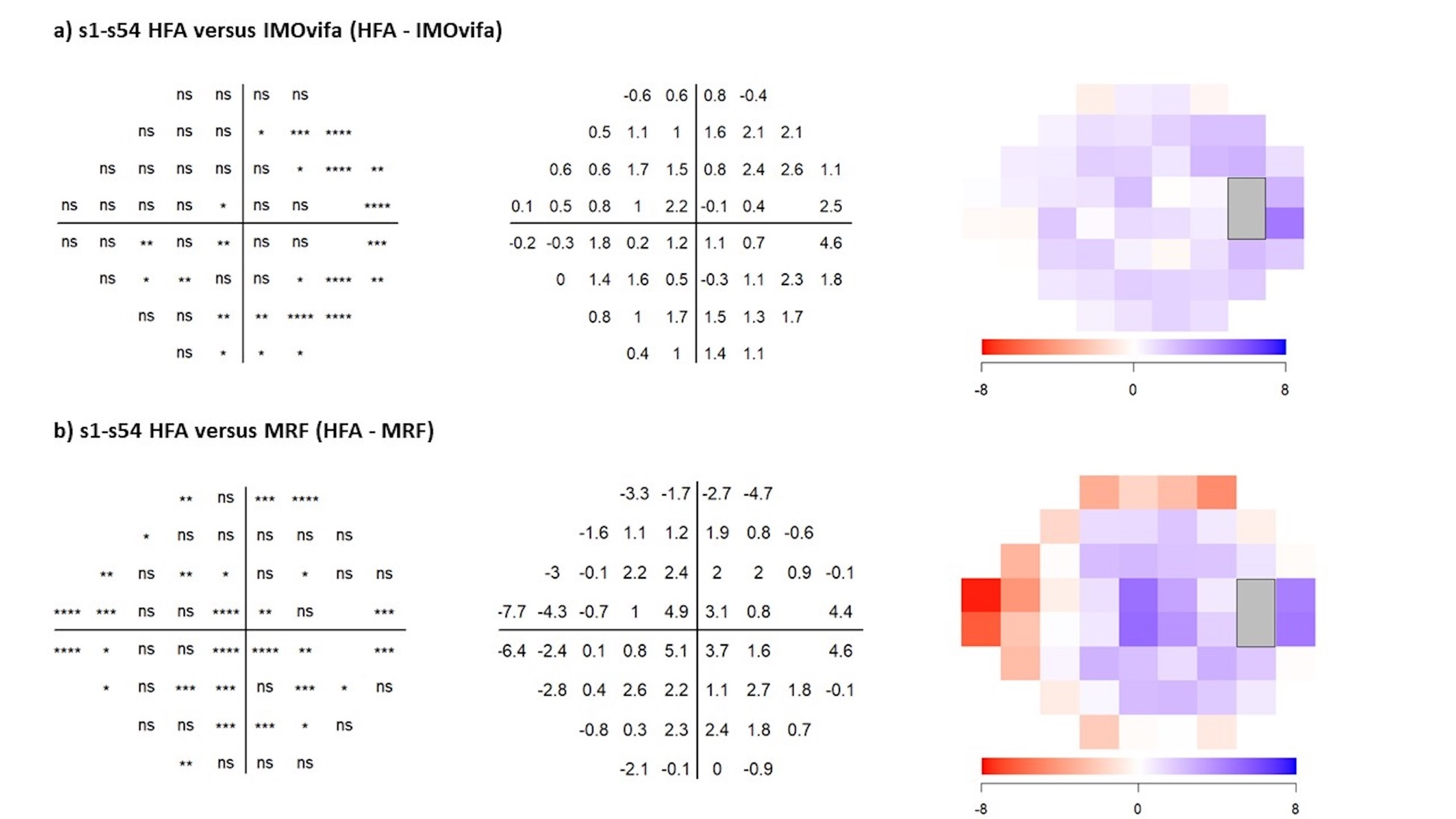 Point by point analysis of sensitivities at each testing location comparing (a) HFA and IMOvifa and (b) HFA and MRF. Locations and degrees of significantly different values are shown (all eyes plotted as right eye). Adapted from Invest. Ophthalmol. Vis. Sci. 2022;63(7):1278 – A0418.